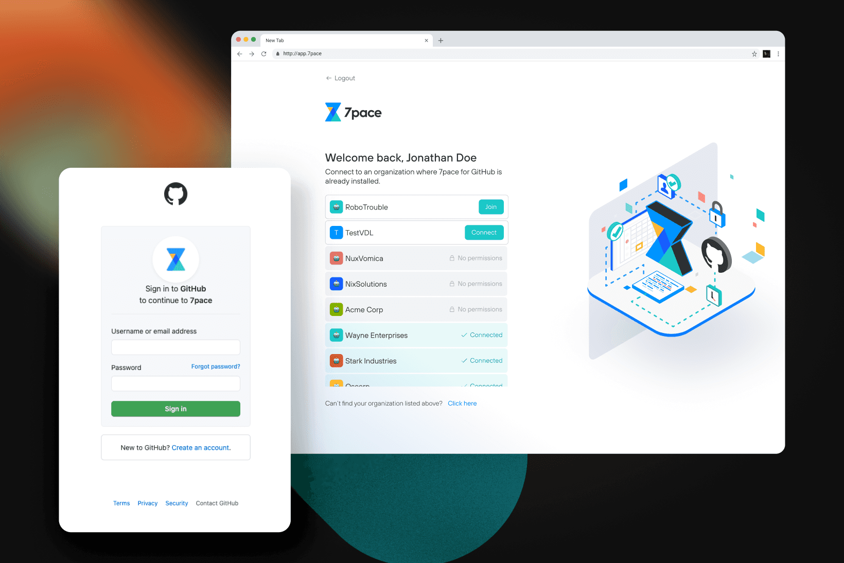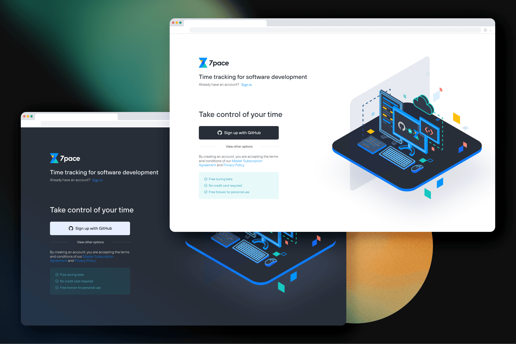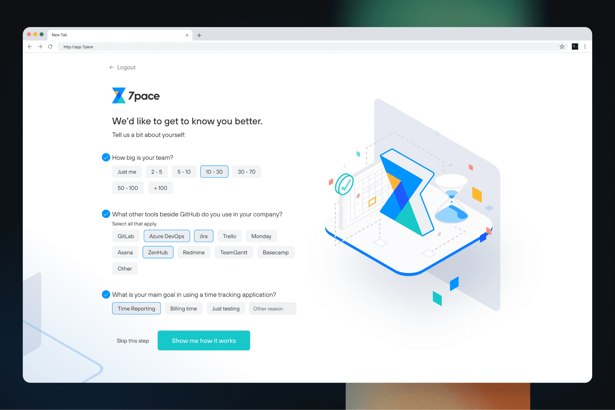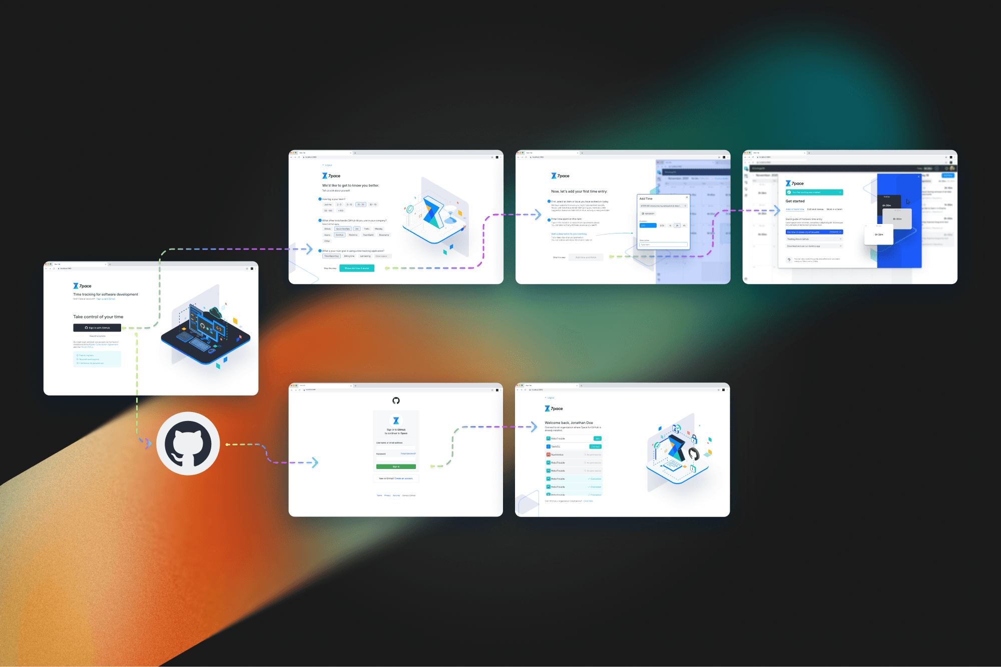 I worked on the onboarding experience for 7pace Hub, a product exploring how time tracking data could be accessed across multiple platforms like Azure DevOps and GitHub. My focus was on designing the sign-in and onboarding flow as the first touchpoint into this system.