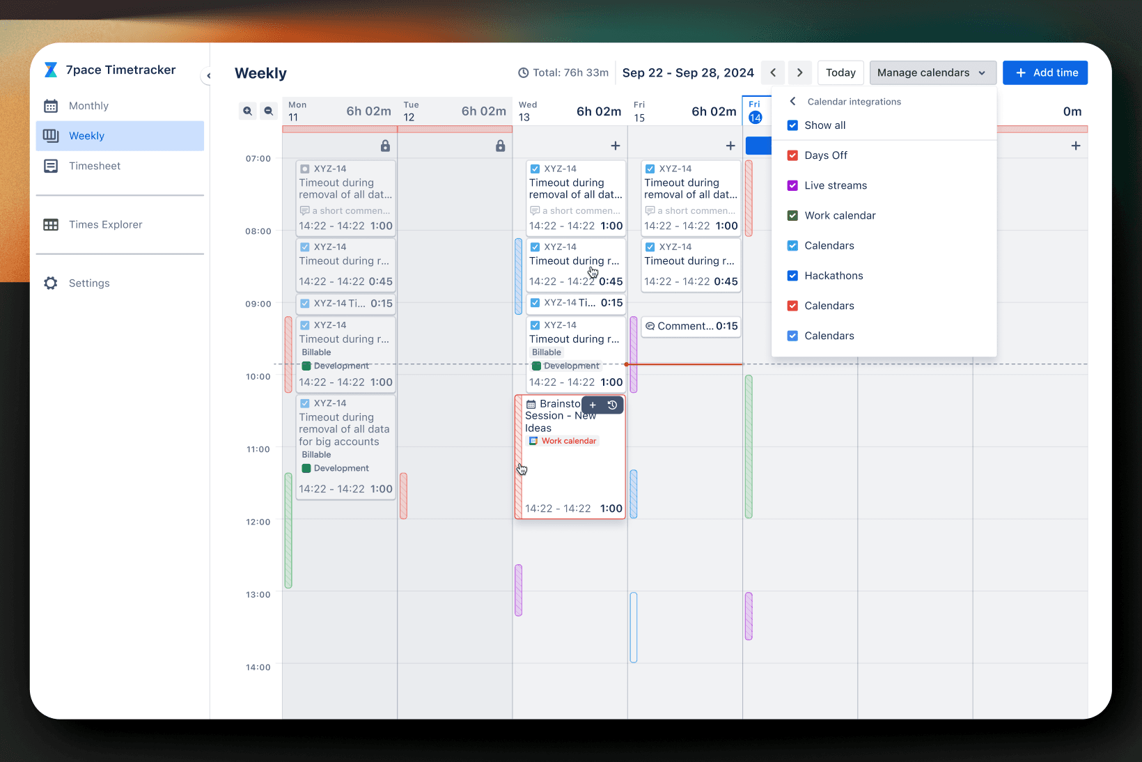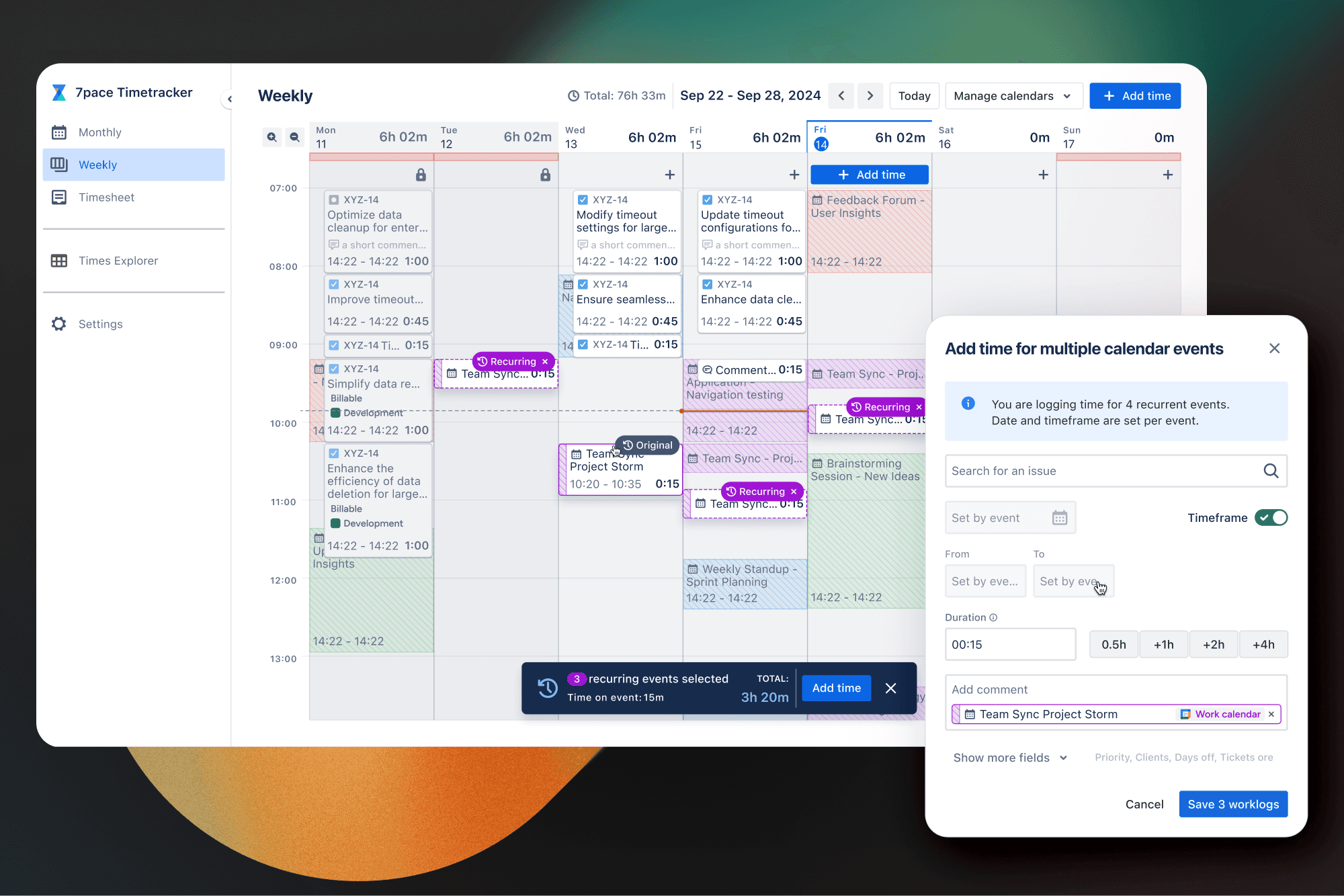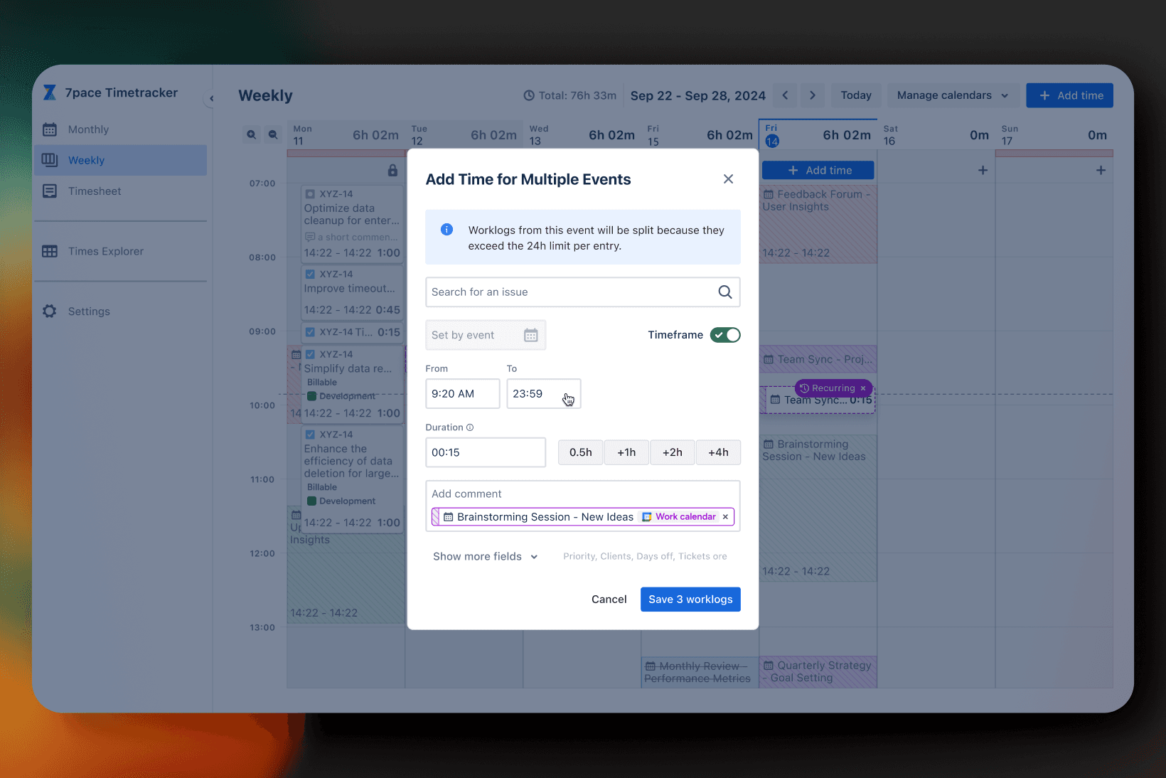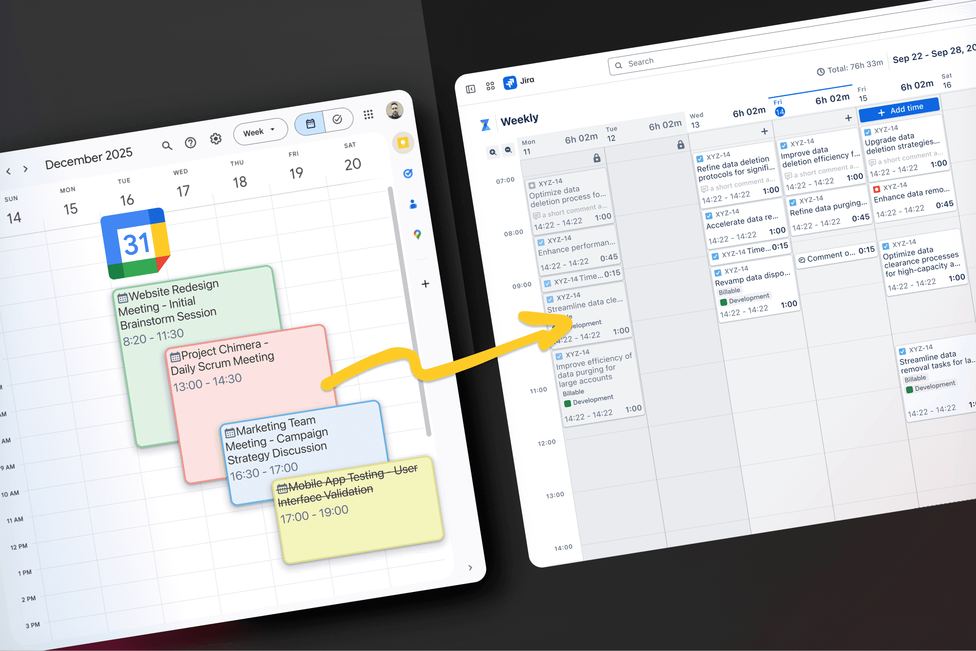 I reframed time tracking from recall to recognition. By integrating calendar events directly into the workflow, users can log time based on what already happened. The solution introduced a unified calendar where worklogs and external events coexist, allowing users to review, convert, and edit entries inline within a familiar interface.
