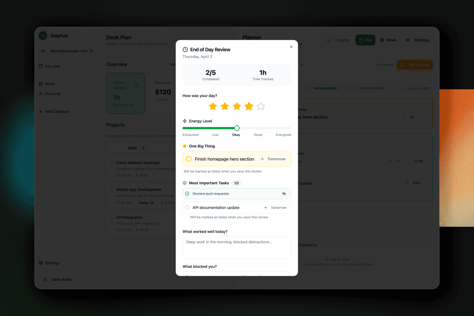 Dayrize introduces a simple rule: one main focus for the day, supported by a small set of important tasks.