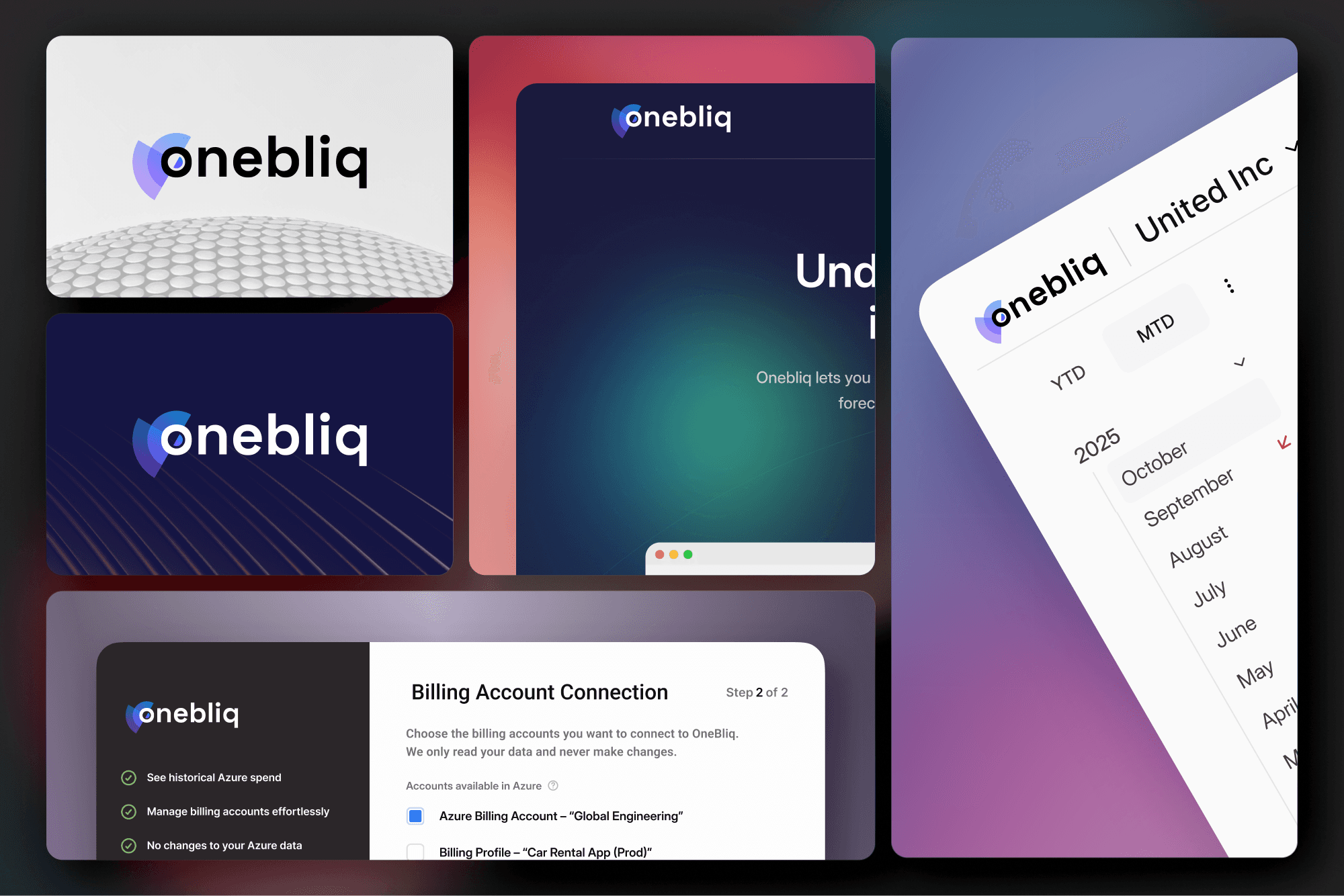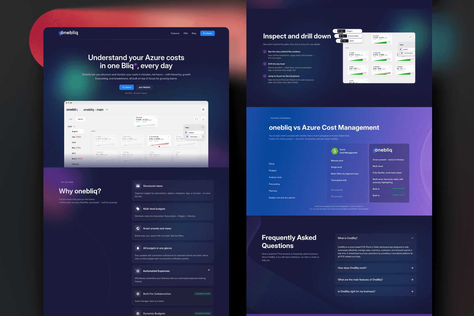 I worked on onebliq, a lightweight Azure cost management product, contributing across branding, landing experience, and core product design. My focus was shaping a clear, cohesive experience from onboarding to cost exploration.