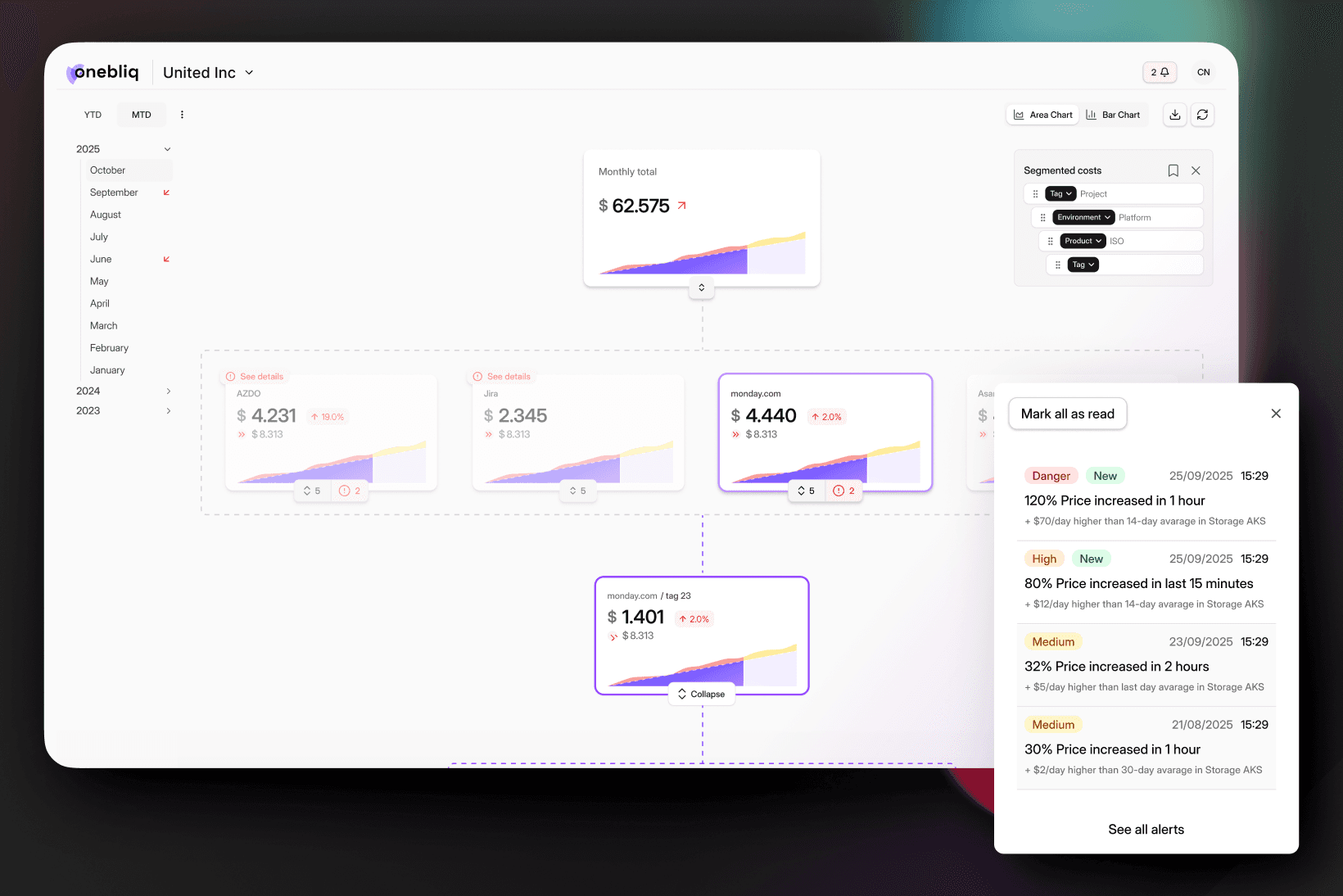 I focused on translating complex cost structures into a visual, navigable system. Instead of dense tables, the product uses a hierarchical, expandable interface that mirrors how costs are organized in Azure, but presented at a higher level of abstraction. Users can move from overview to detail through progressive disclosure, identifying patterns, anomalies, and cost drivers without losing context. The experience prioritizes clarity, fast onboarding, and minimal interaction cost.